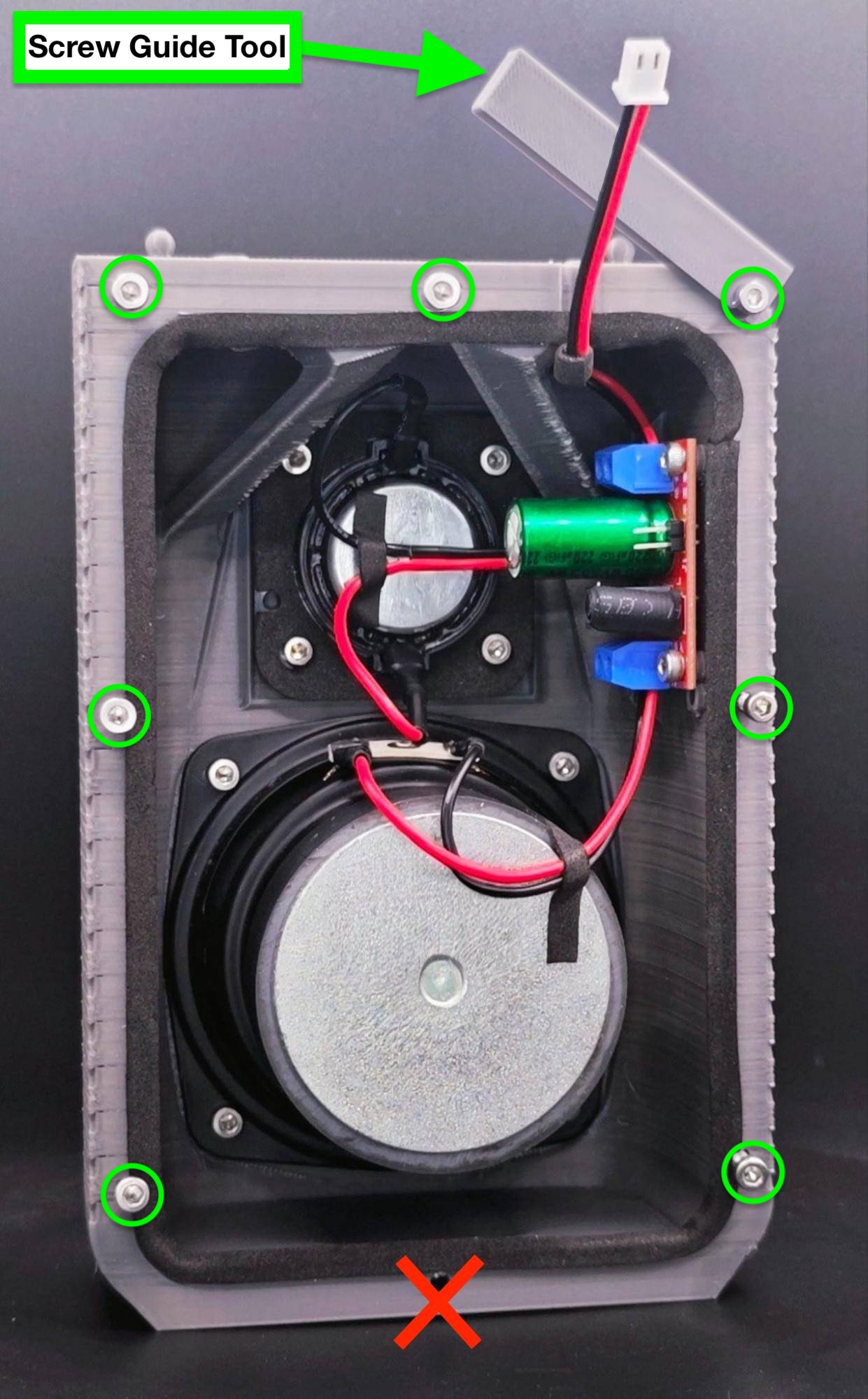 1. Use four (4) M3x10mm hex screws to install the tweeter with the terminals facing north and south.- Use another four (4) M3x10mm hex screws to install the woofer with both speaker terminals facing north.