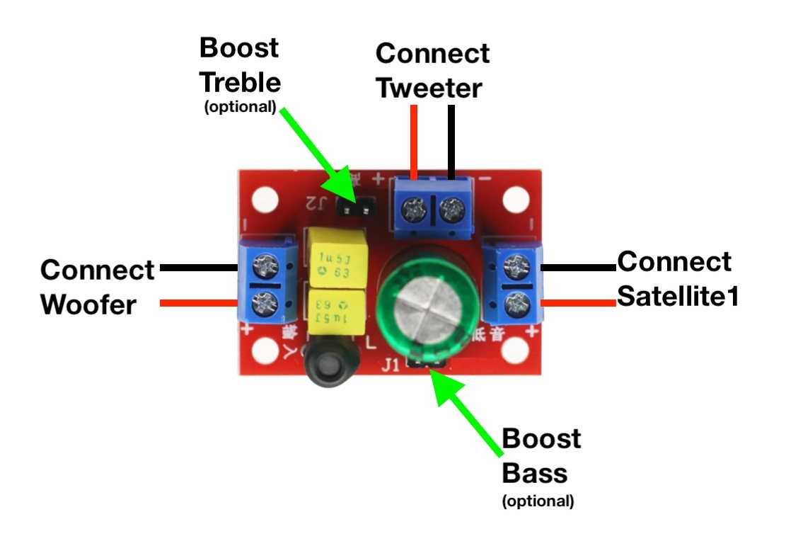 - Optionally use the supplied jumpers to boost bass and/or treble.