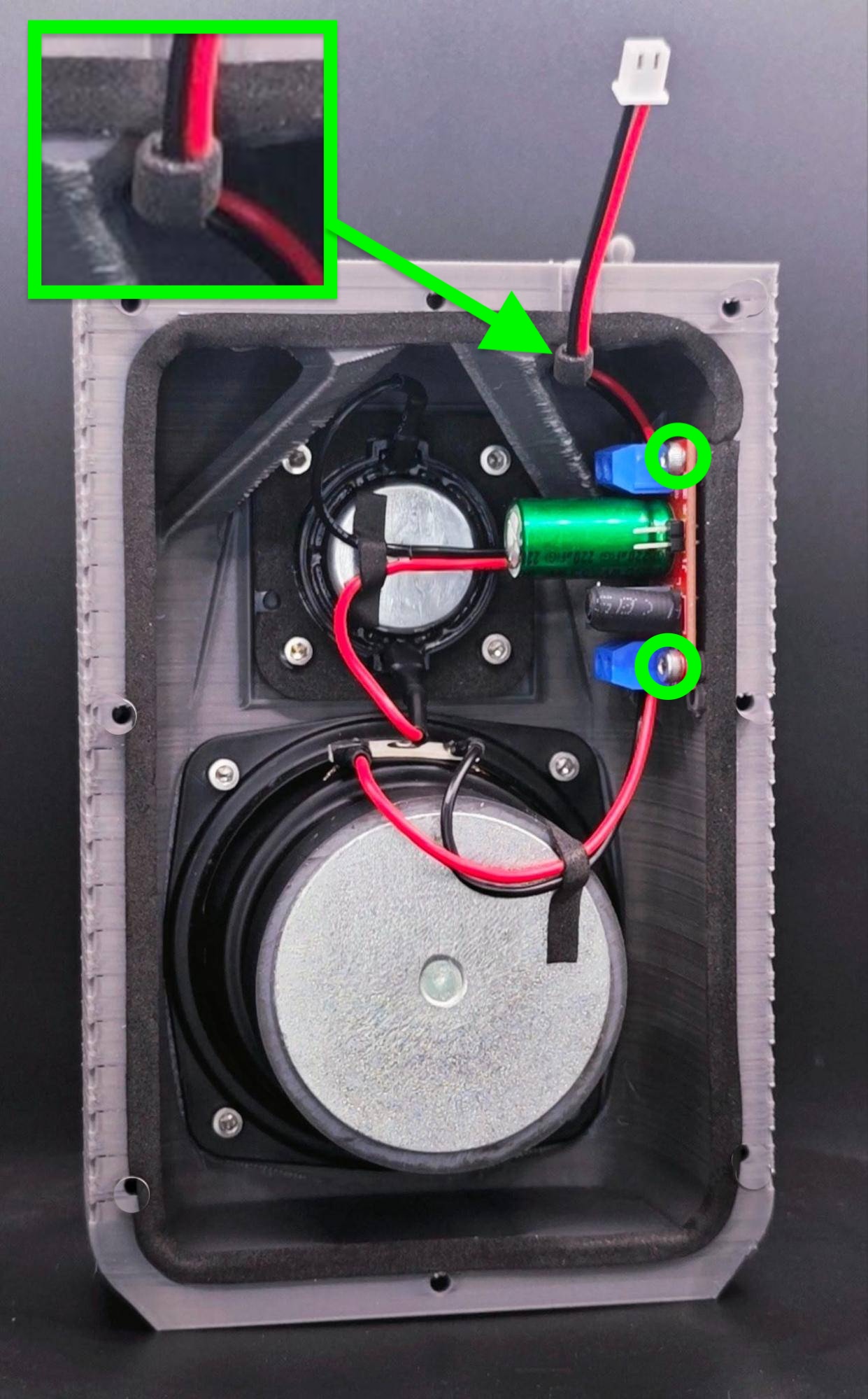 1. Use two (2) M3x10mm hex screws to securely mount the crossover to the front piece. Connect cables to speakers. - We recommend applying sealing foam around the JST-XH cable to ensure an airtight seal at the speaker hole.