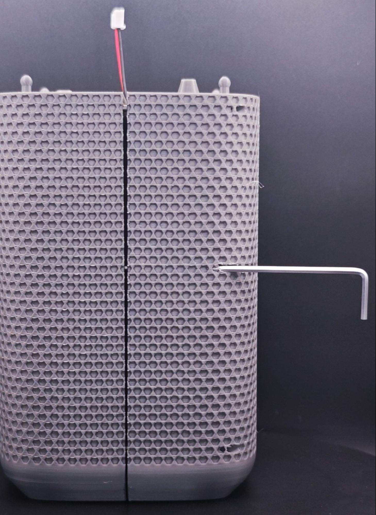 Align the two chamber parts together, making sure the JST wire is not pinched and that the foam forms an airtight seal. Slide the parts together with the front piece moving downward and the back piece moving upward. -